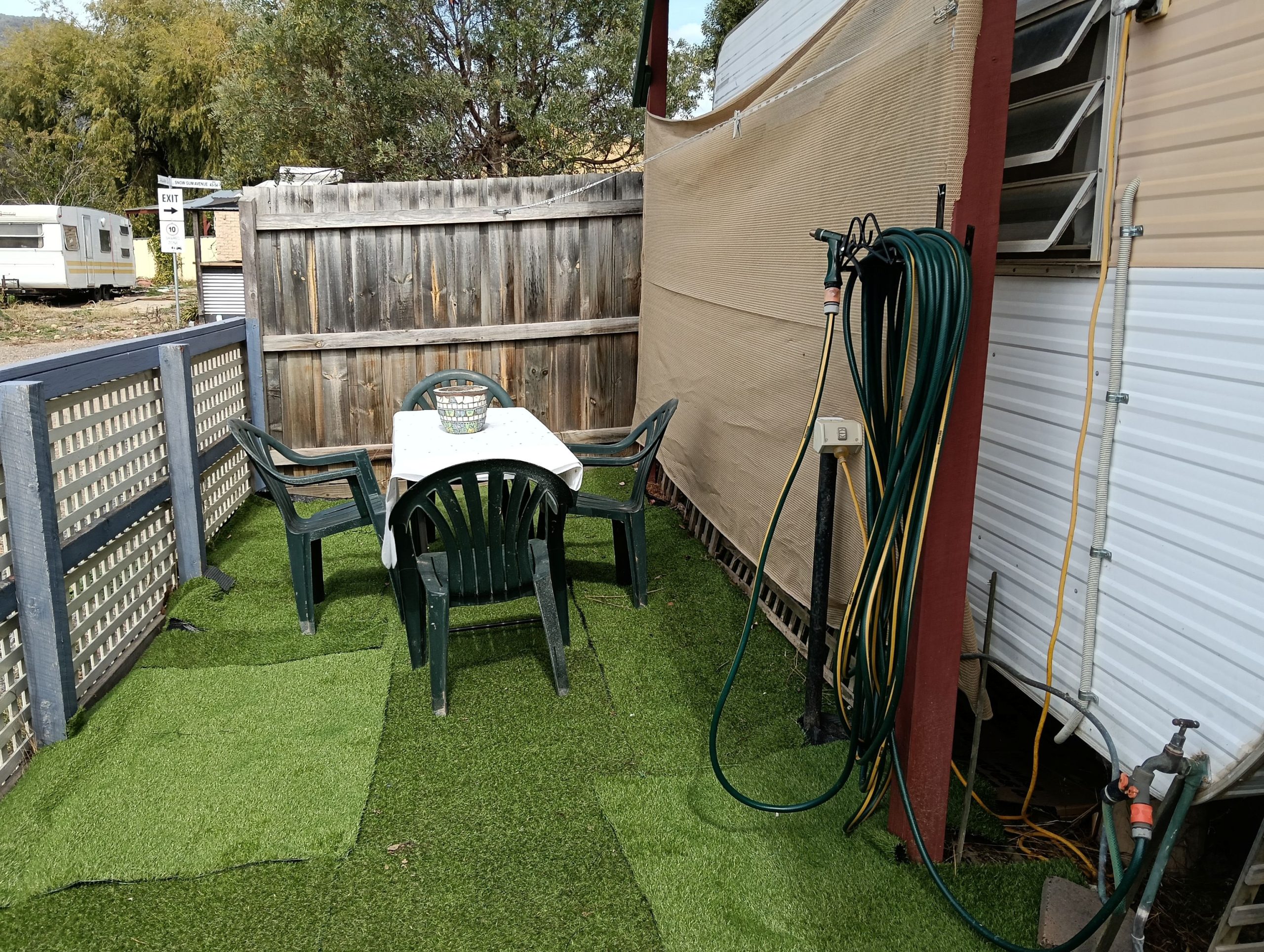 Good size fully fenced corner block, large steel flyover covers caravan, annex and decking.